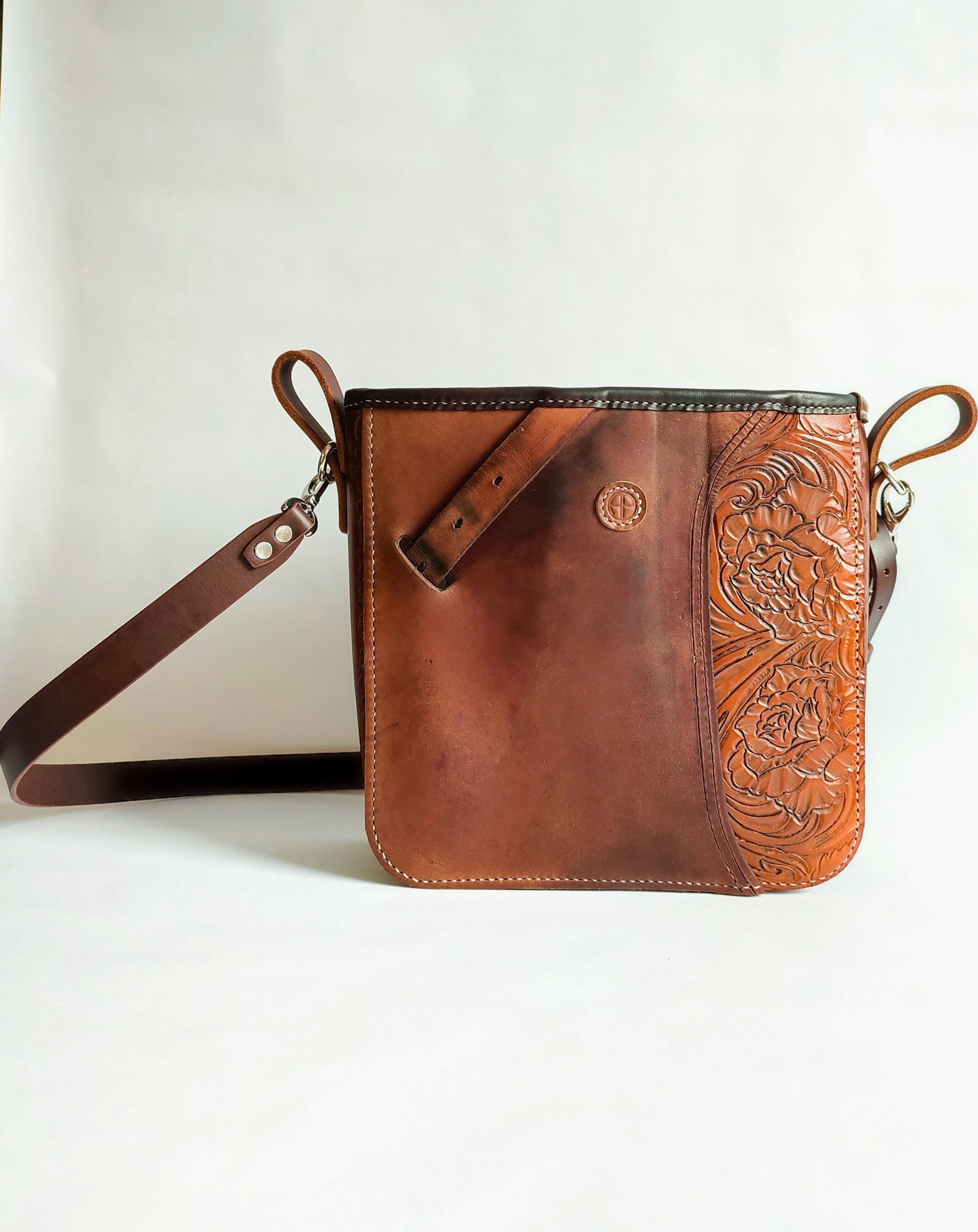 Cette pièce unique combine un quartier de selle avec un morceau de cuir repoussé à la main au motif de roses, inspiré des selles western. Elle possède une doublure intérieure tissu avec pochette.