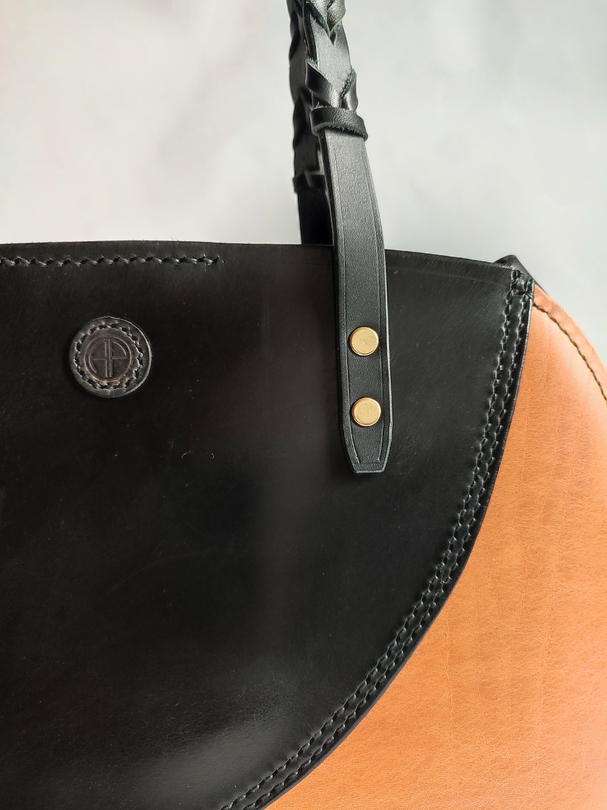 Tote bag cuir de selle - Bicolore noir/cognac - Rênes tressées - Maroquinerie cavalière.